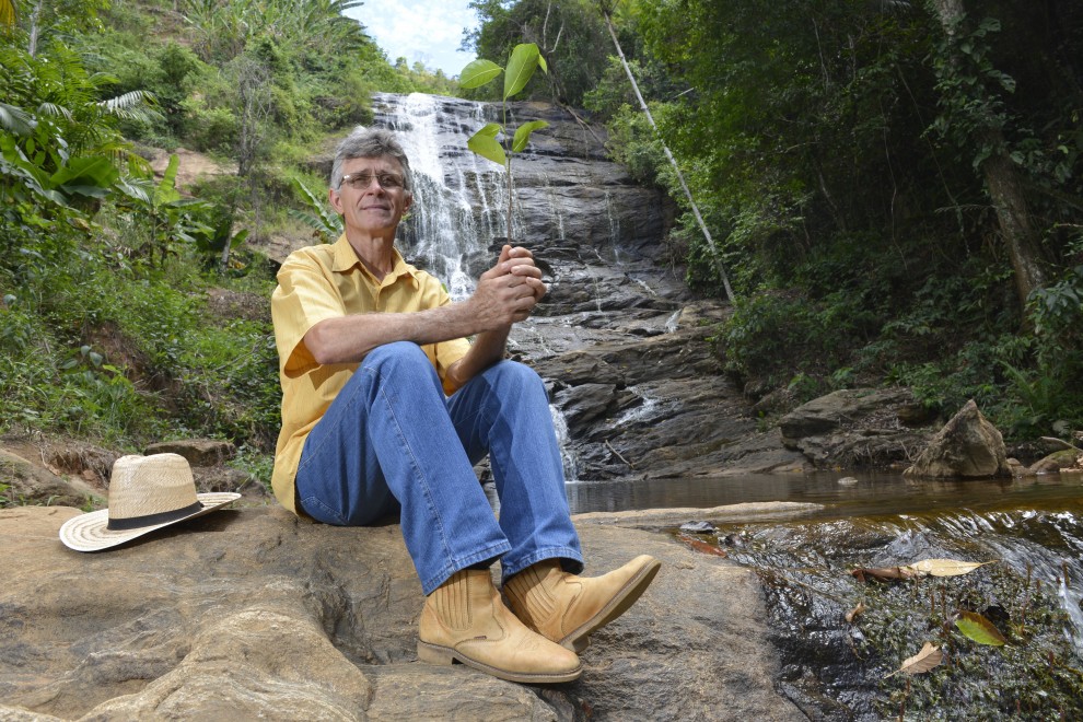 Aloísio Sgulmaro escala a cachoeira do seu sítio, em Alfredo Chaves, no Sul do Espírito Santo. Senta-se sobre uma das pedras e posa para a foto, tendo ao fundo a água que escorre lá do alto. Pensativo, constata: o volume atual é pelo menos quatro vezes menor do que o registrado há quatro anos, quando foi fotografado por A Gazeta, no mesmo local.